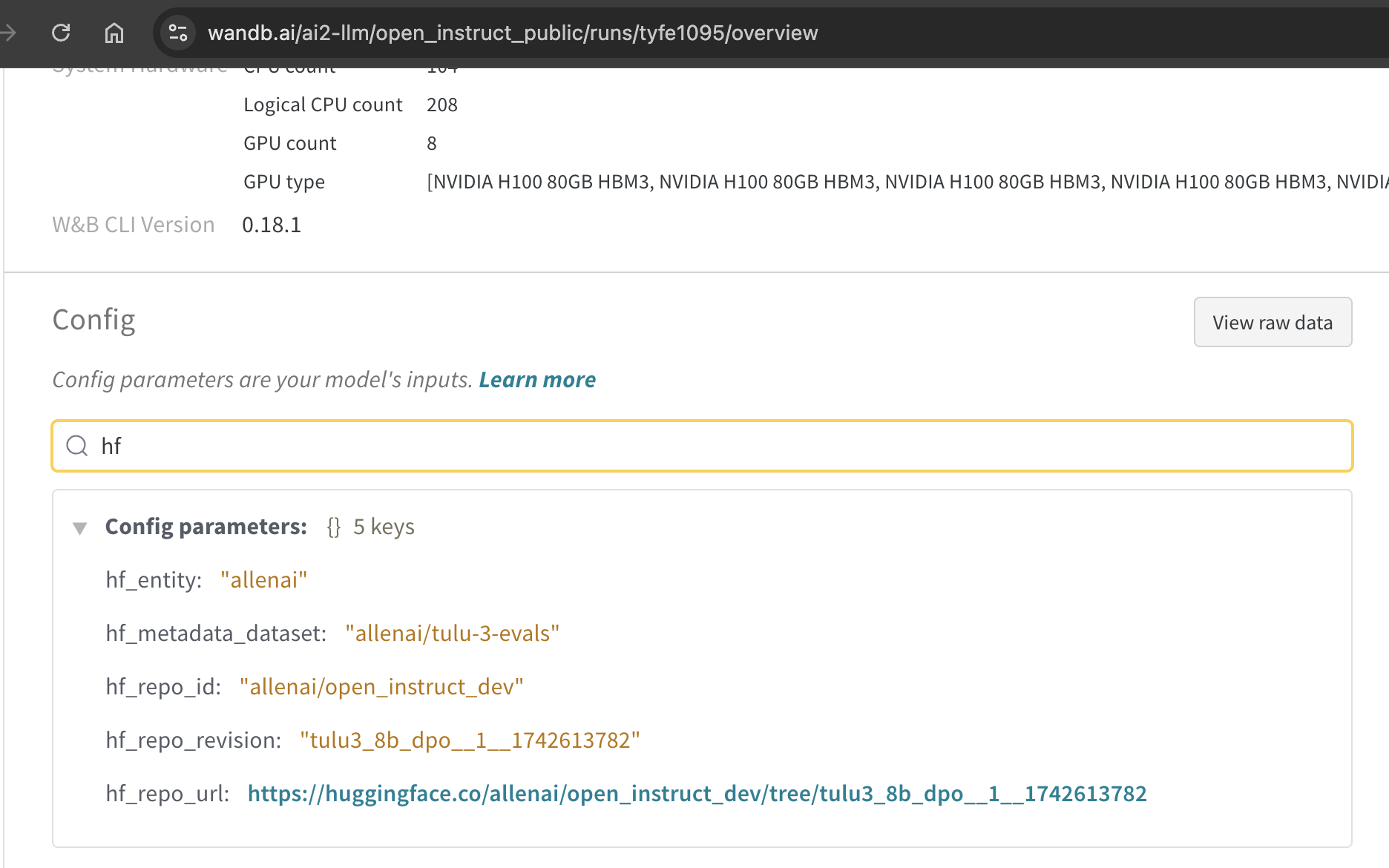 Let's use https://wandb.ai/ai2-llm/open_instruct_public/runs/tyfe1095 as an example. If you go to its wandb's Overview page -> config -> search for hf, then you can find this hf_repo_url.